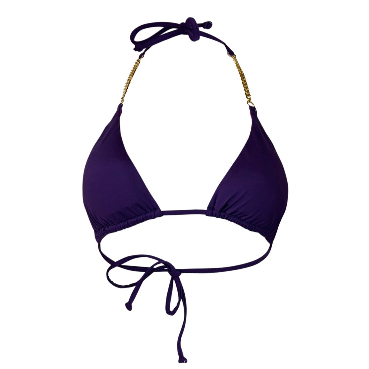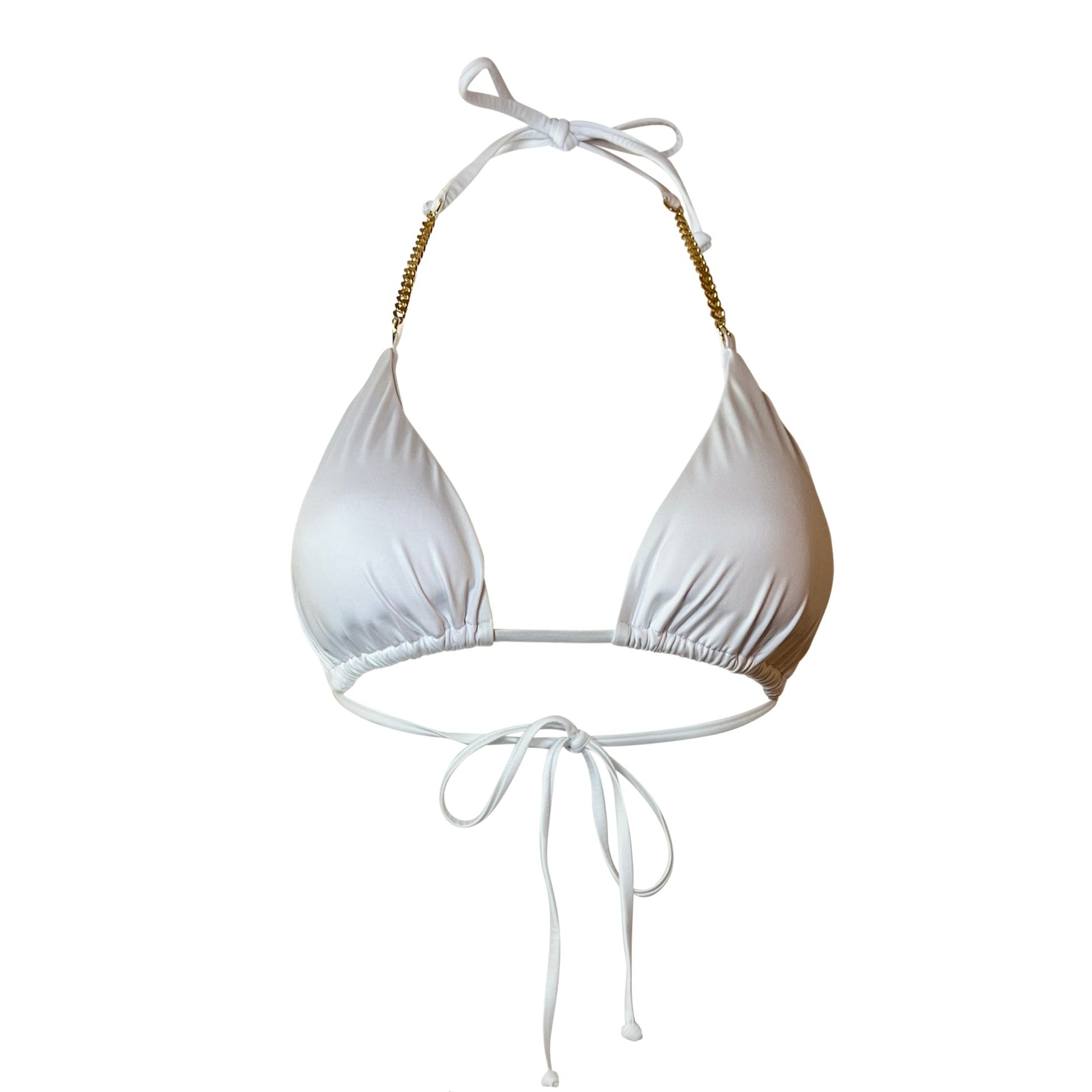 The Bella Top is an eye catcher, as it is the perfect balance between classy and sassy. This top features a triangle cut, with gold chain hardware. Pair with Bella Bottom to complete the set.