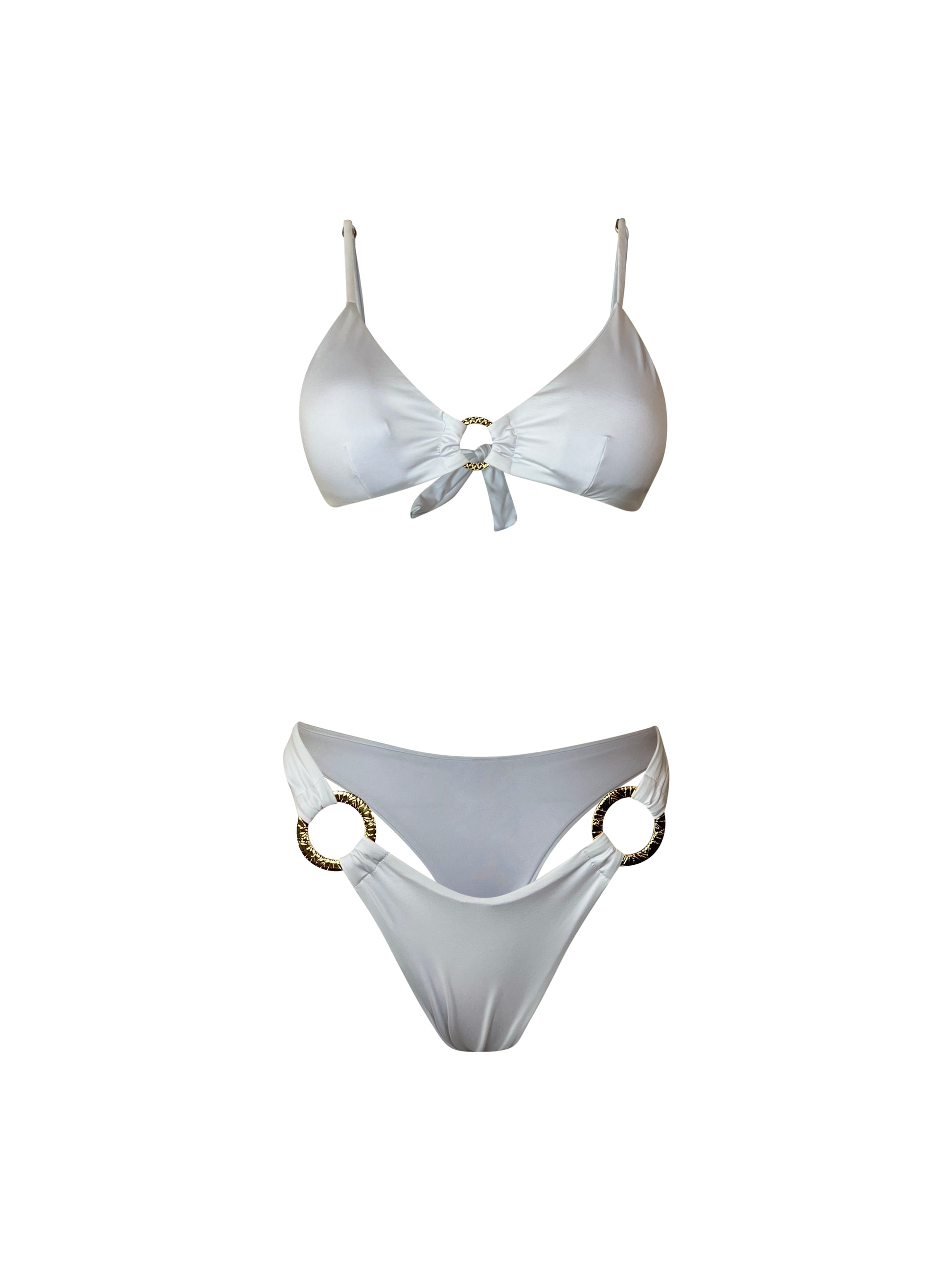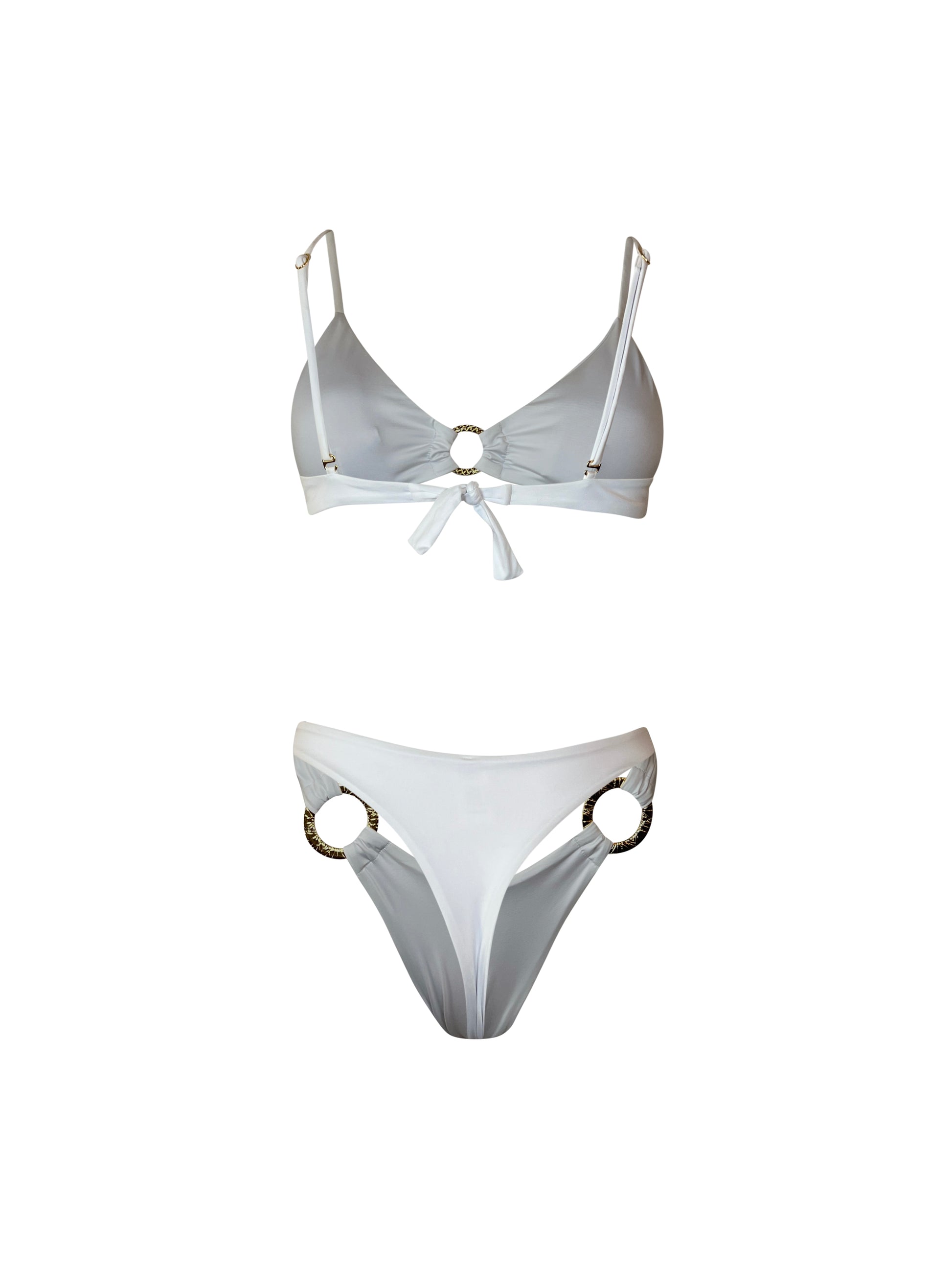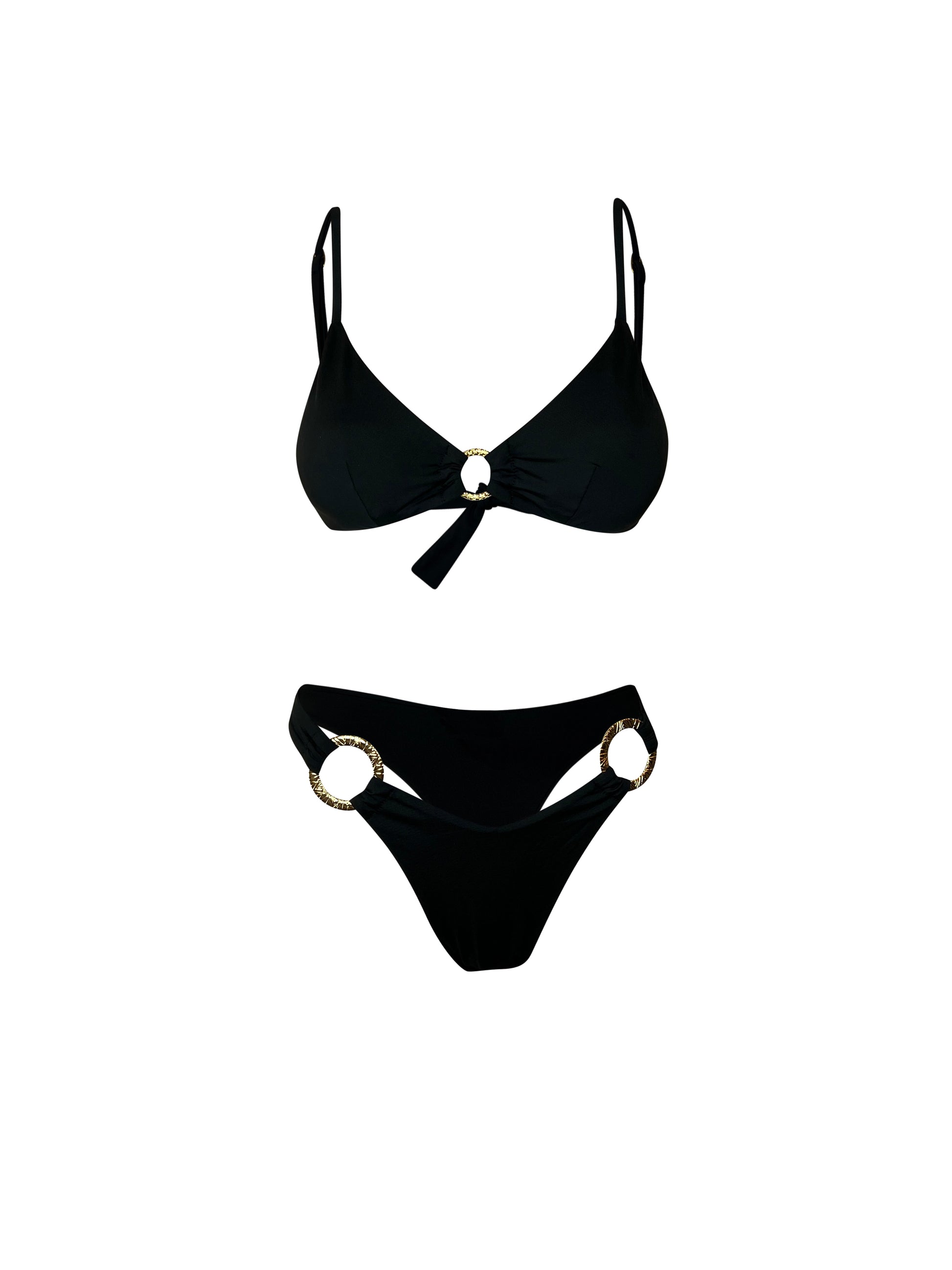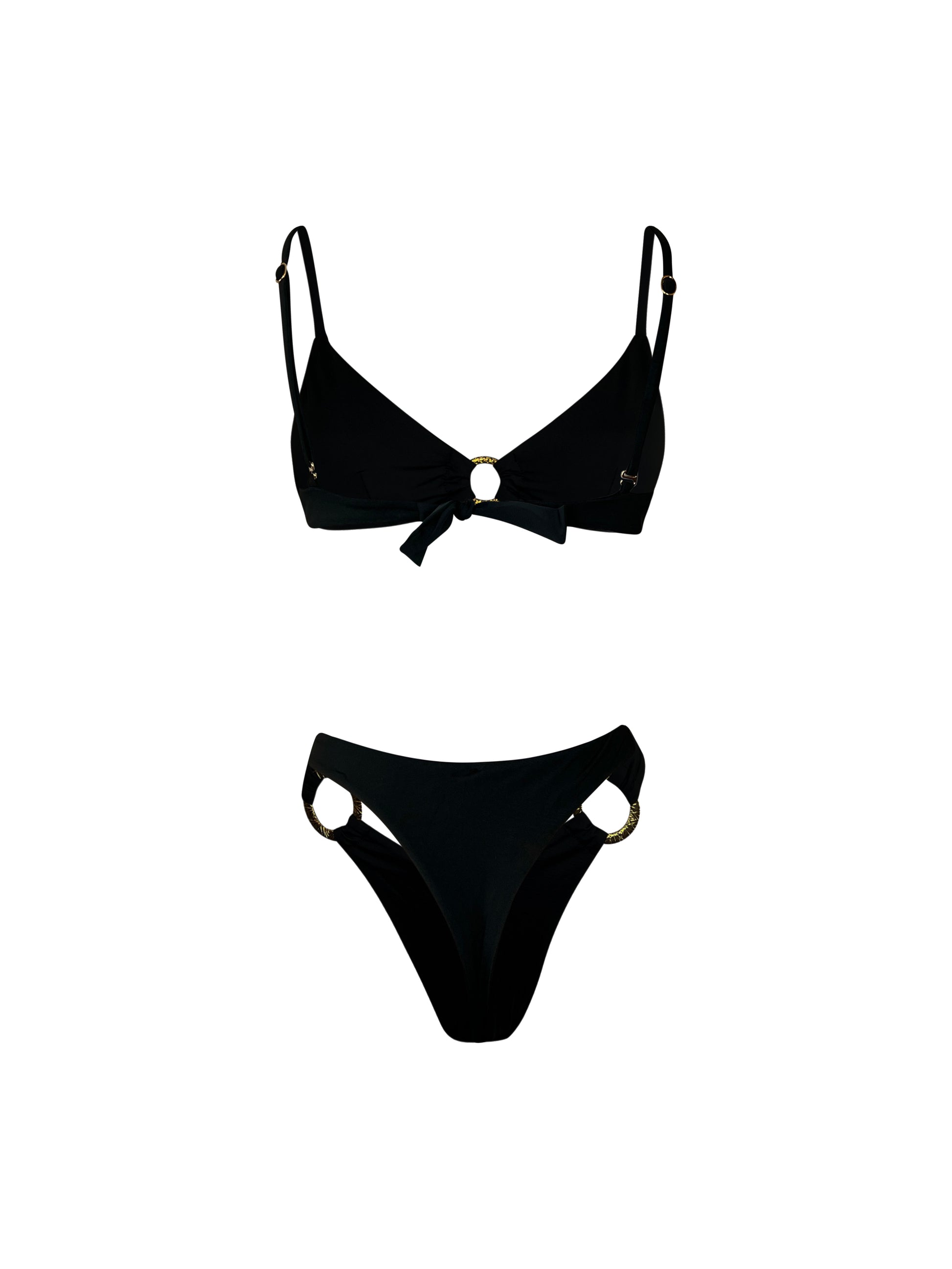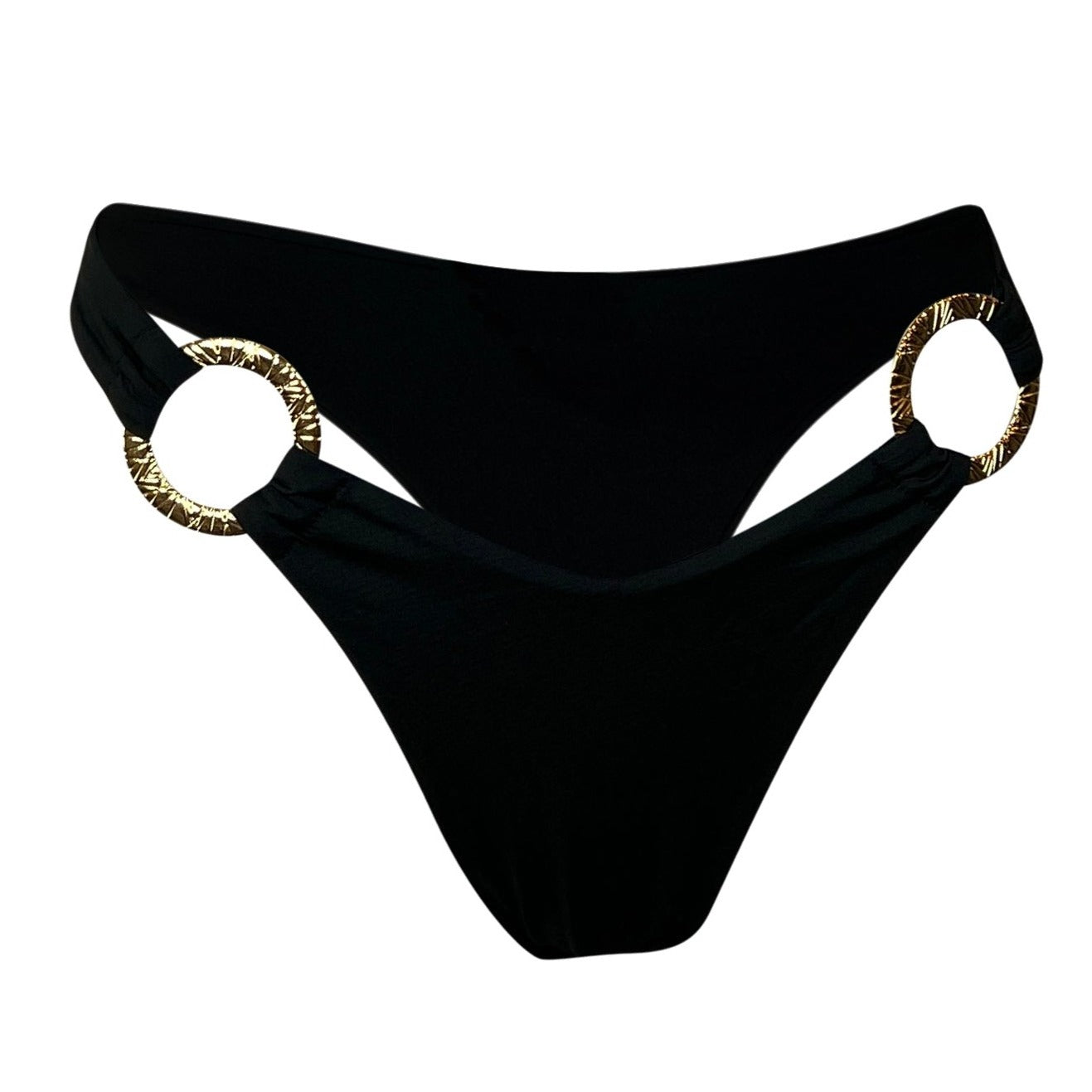 The Amira Bottom is in a category of her own. Providing a little extra coverage in the front, with a Brazilian cut in the back. This bottom is a high waist design, with a slight “V” cut in the front to complement your body. Featuring large textured gold hardware rings. Pair with the Amira Top for the perfect set.